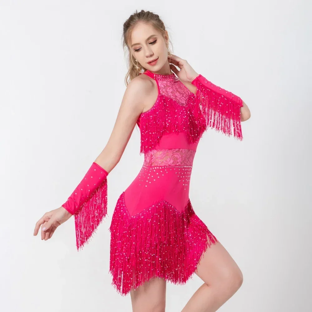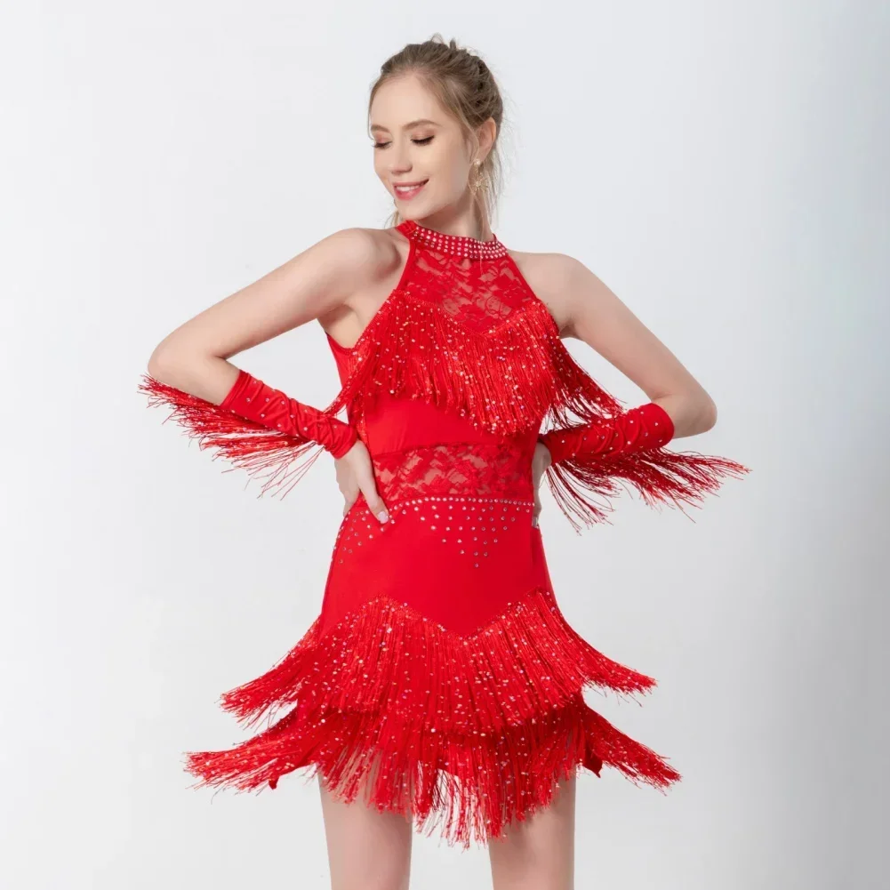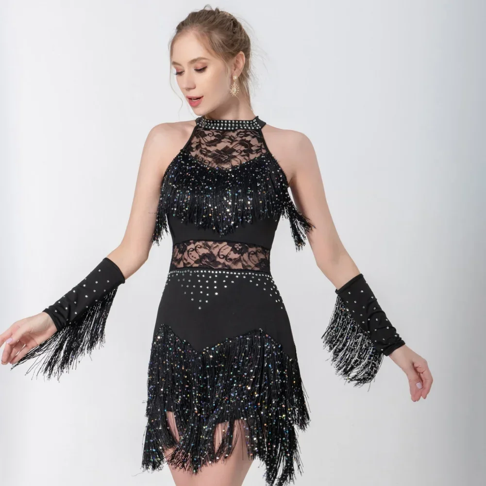 2025 Elegant Sequin Beaded Tassel Latin Dress With Sleeves For Women Sexy Lace Hollow Out Halter Sparkly Rumba -Cha Dancewear
