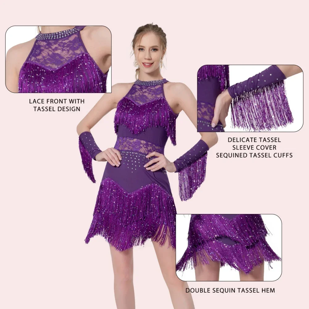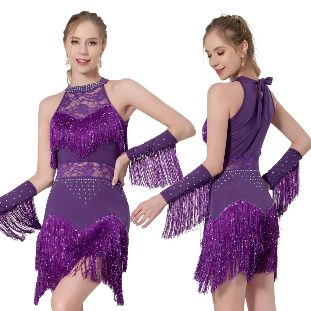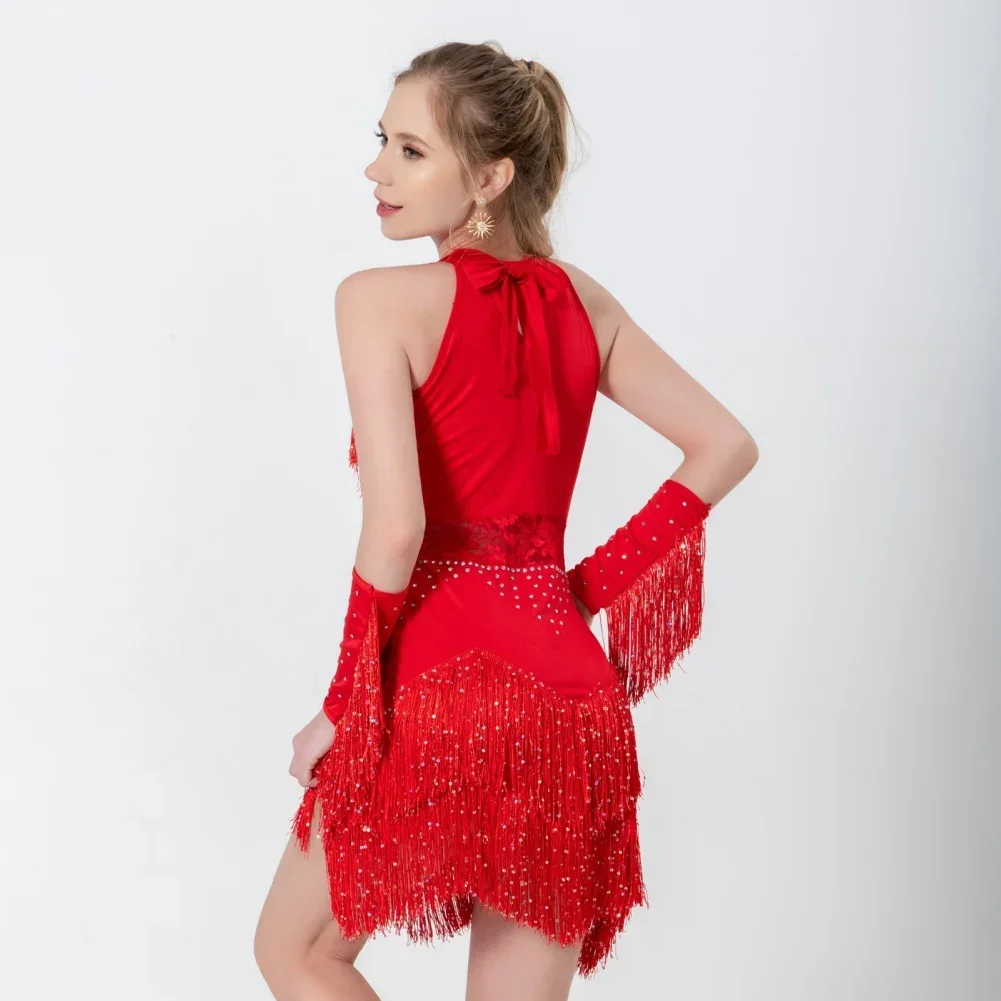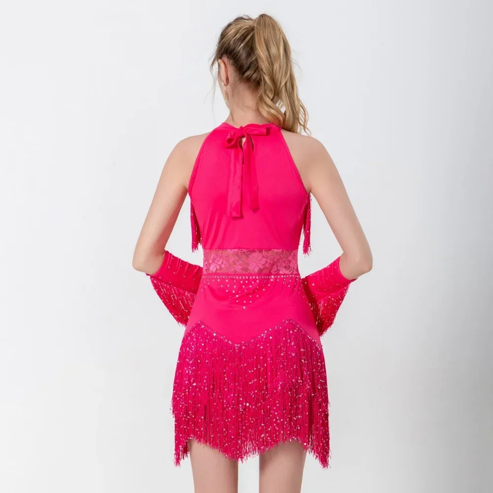 2025 Elegant Sequin Beaded Tassel Latin Dress With Sleeves For Women Sexy Lace Hollow Out Halter Sparkly Rumba -Cha Dancewear