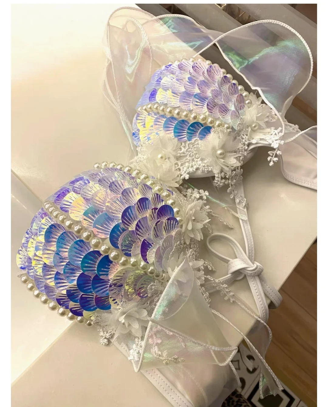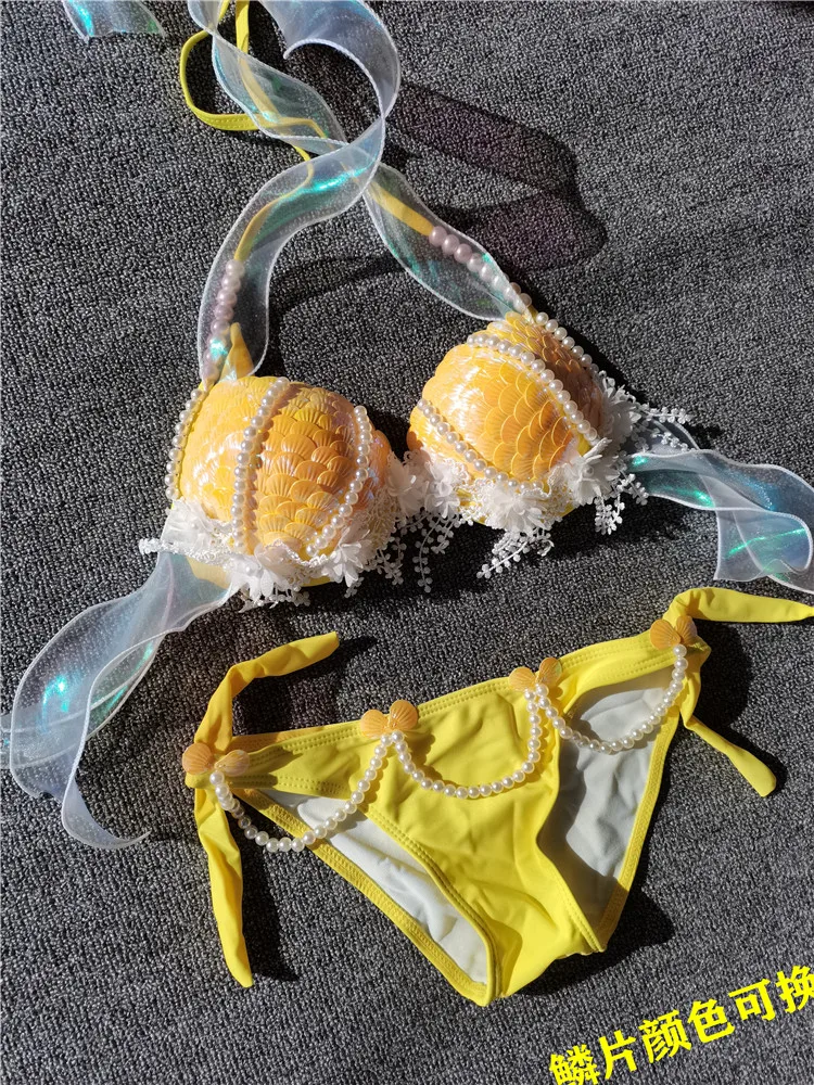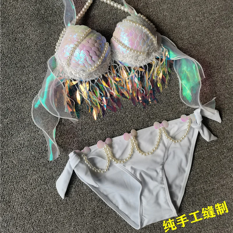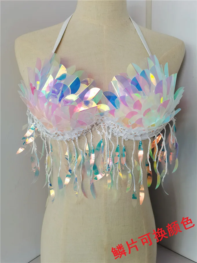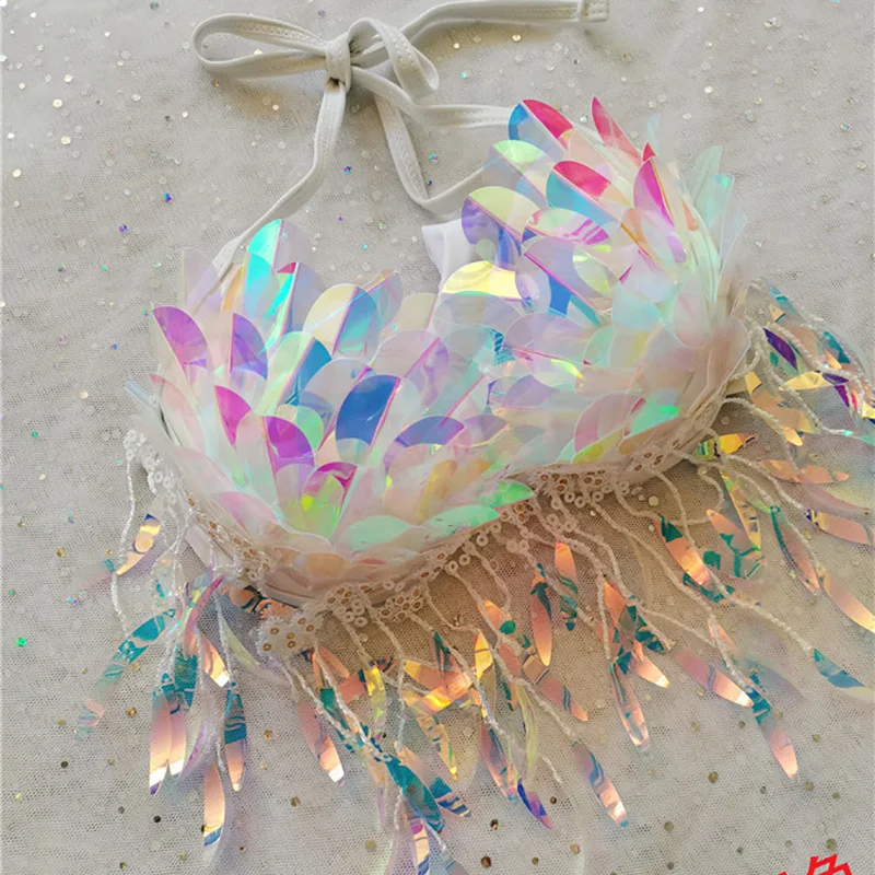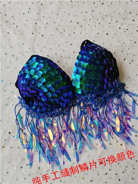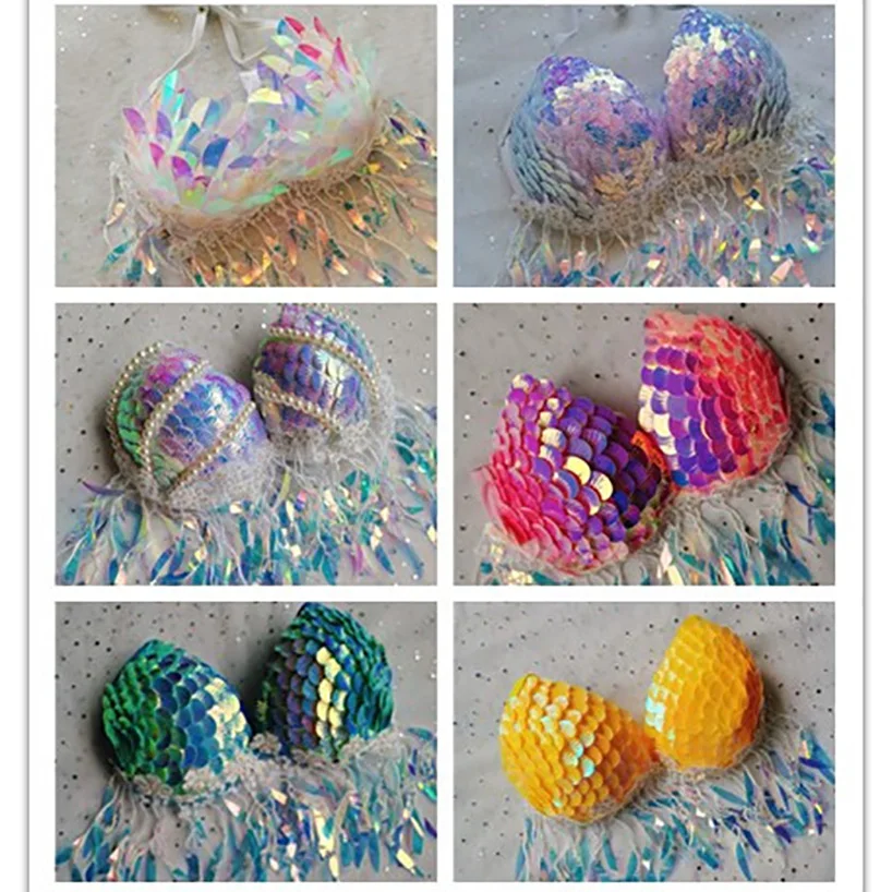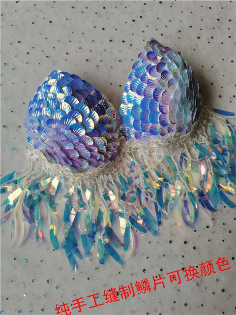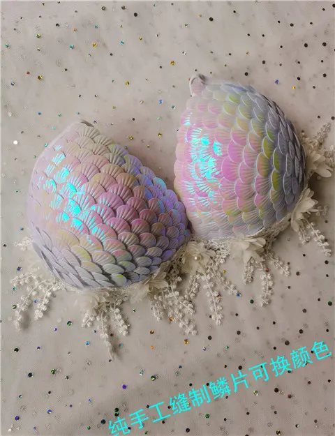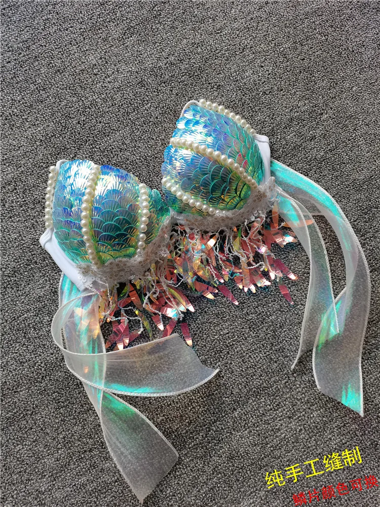 Handmade Mermaid Sequins Seashell Bikini Top Bra Oceanarium Bar Table Performance Costume Fishtail Leather
