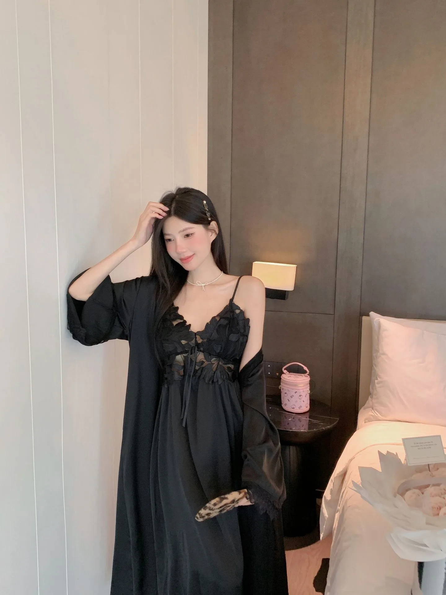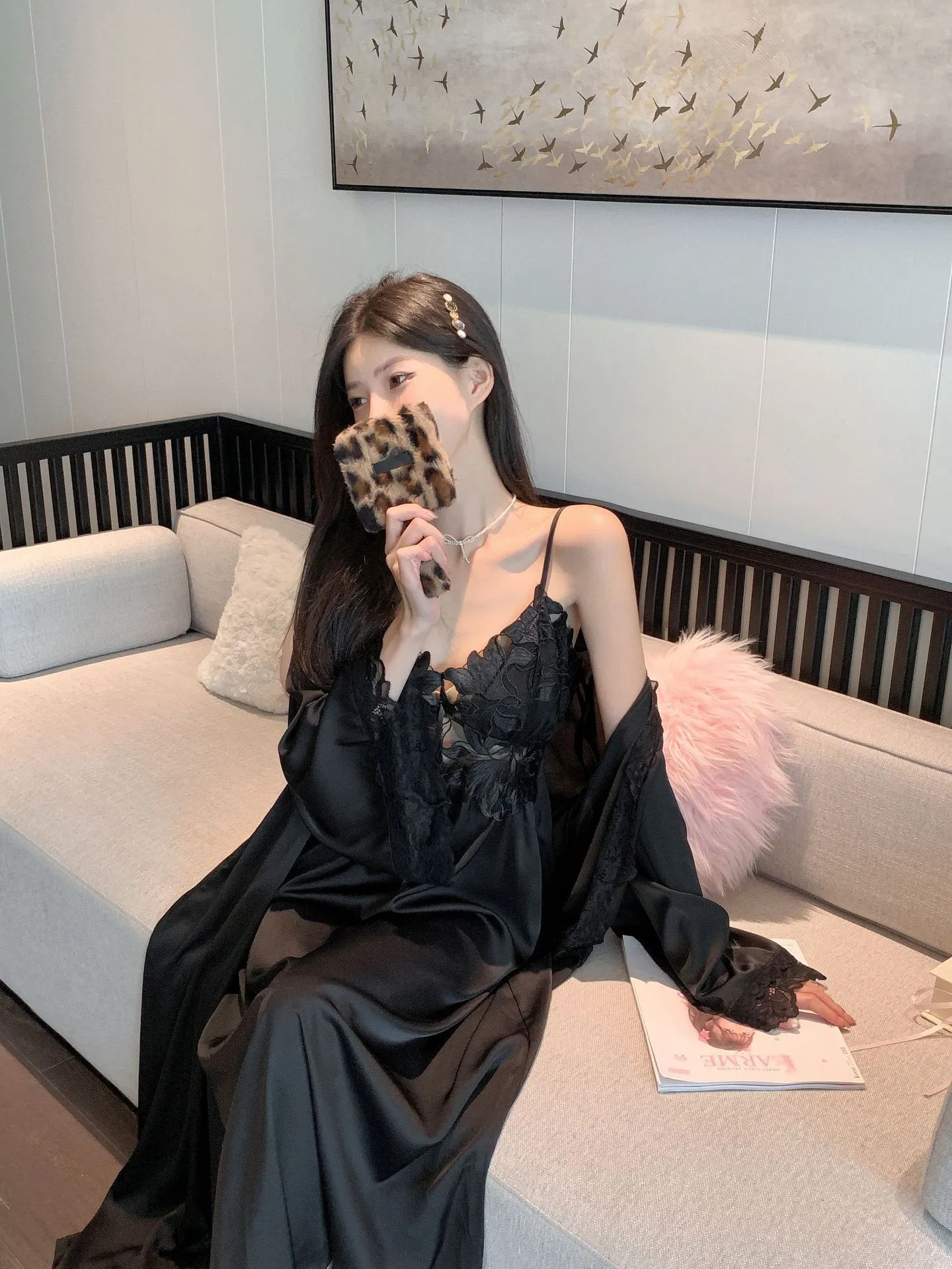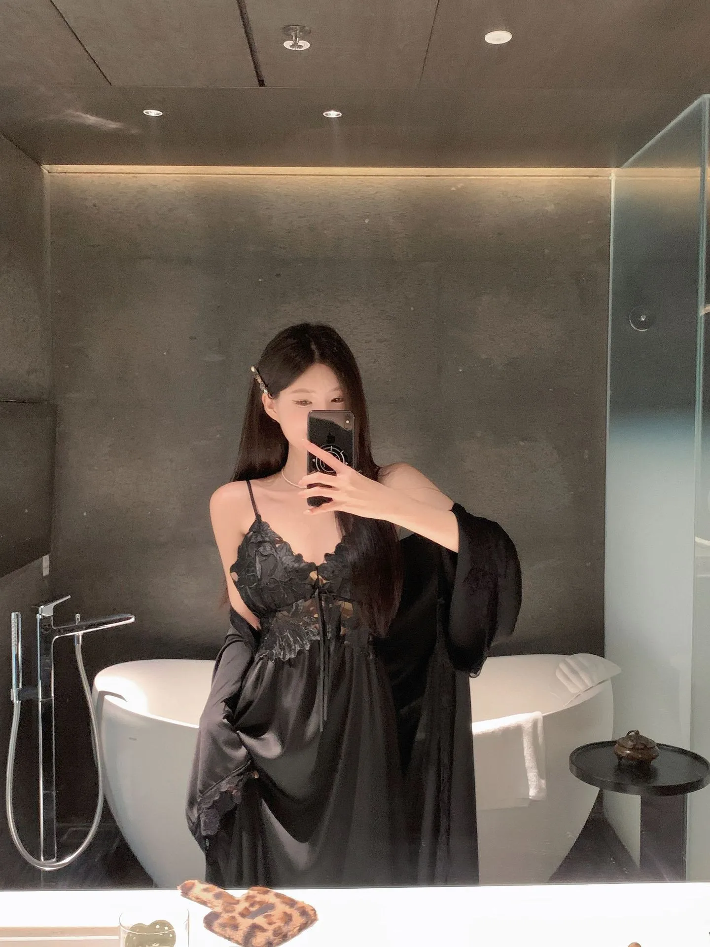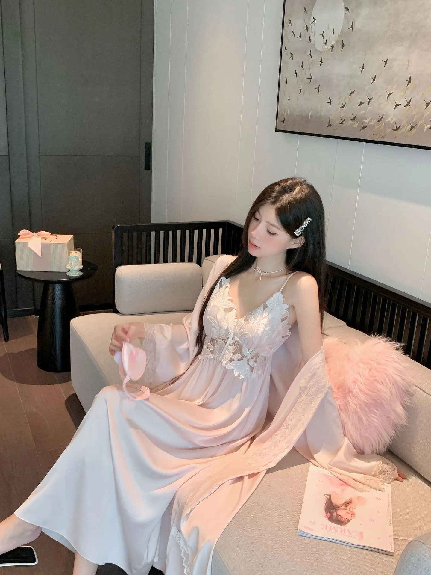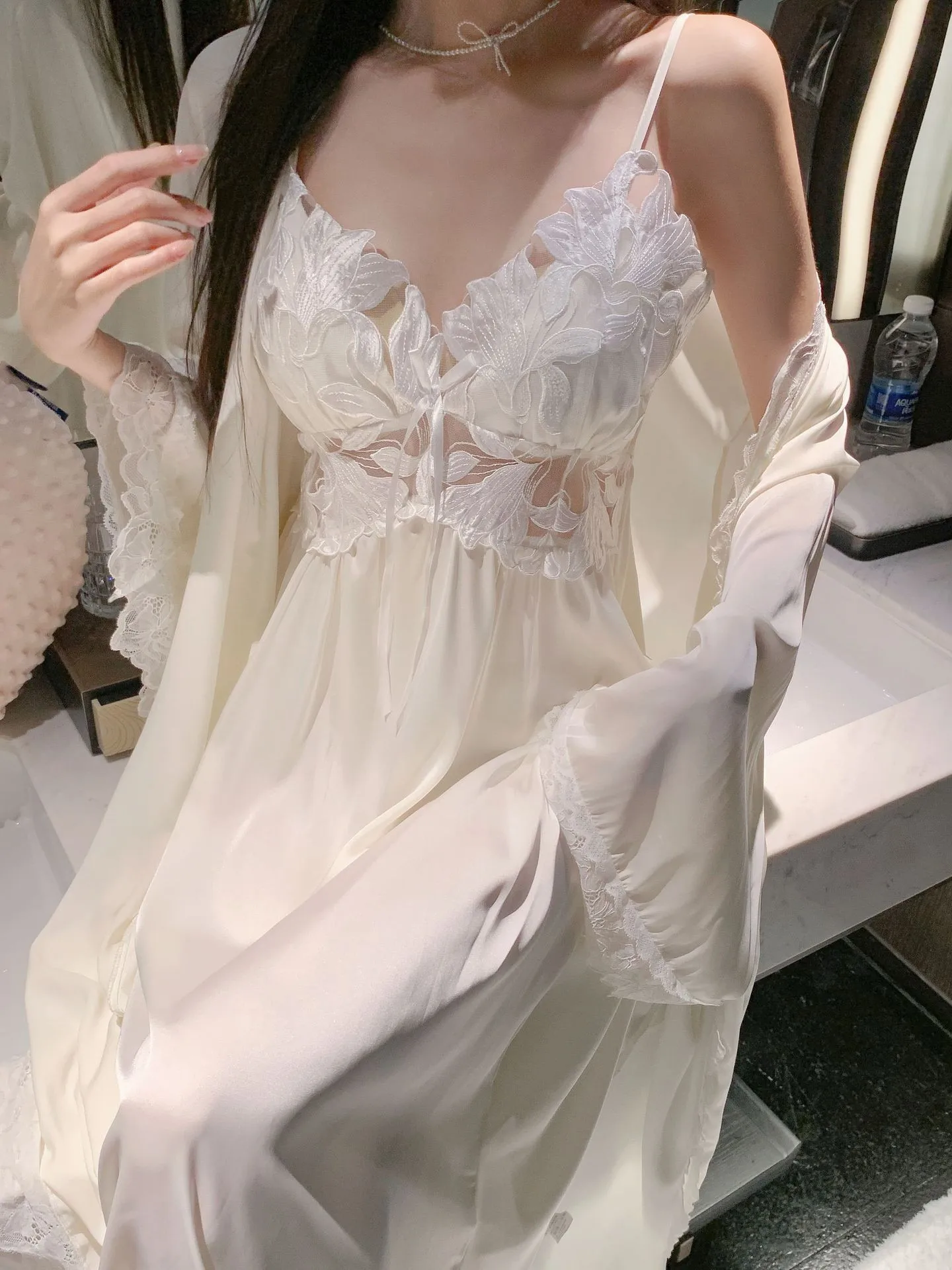 Sexy Black Lace Long Robe Nightgown Female Sleepwear 2Pcs Set Elegant Silky Satin Nightwear Nightdress Loose Homewear Lingerie