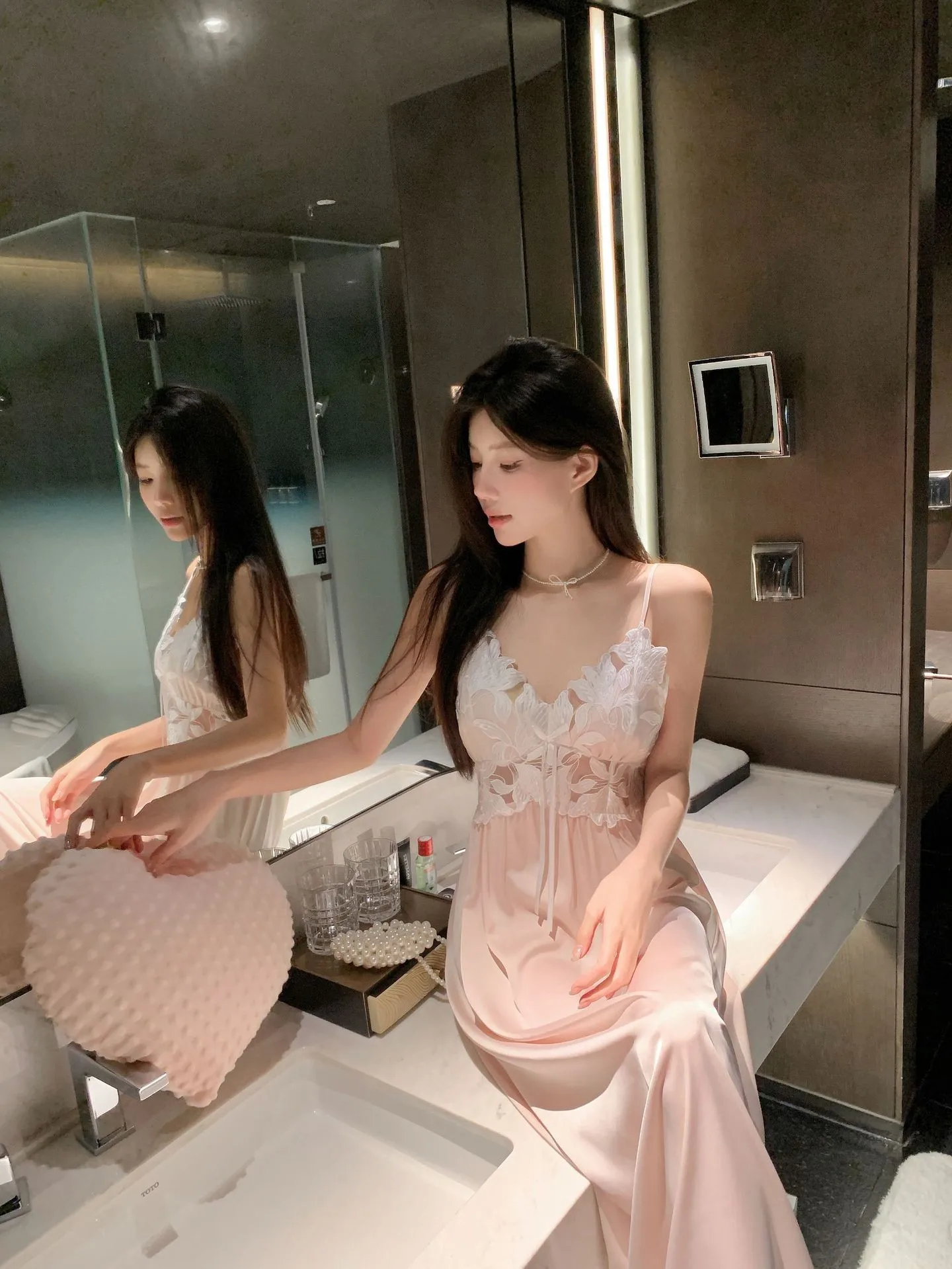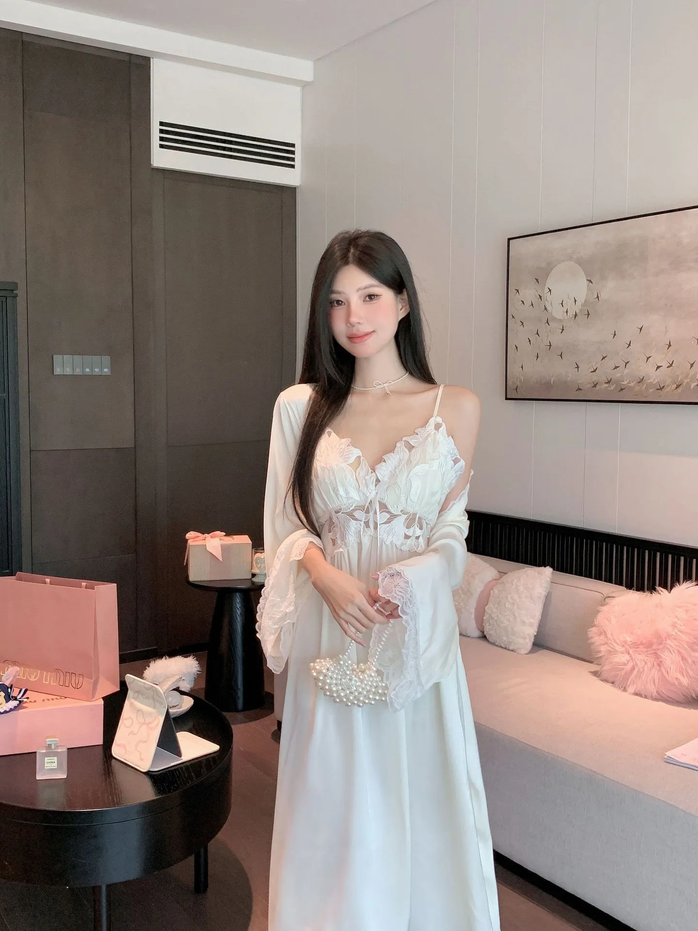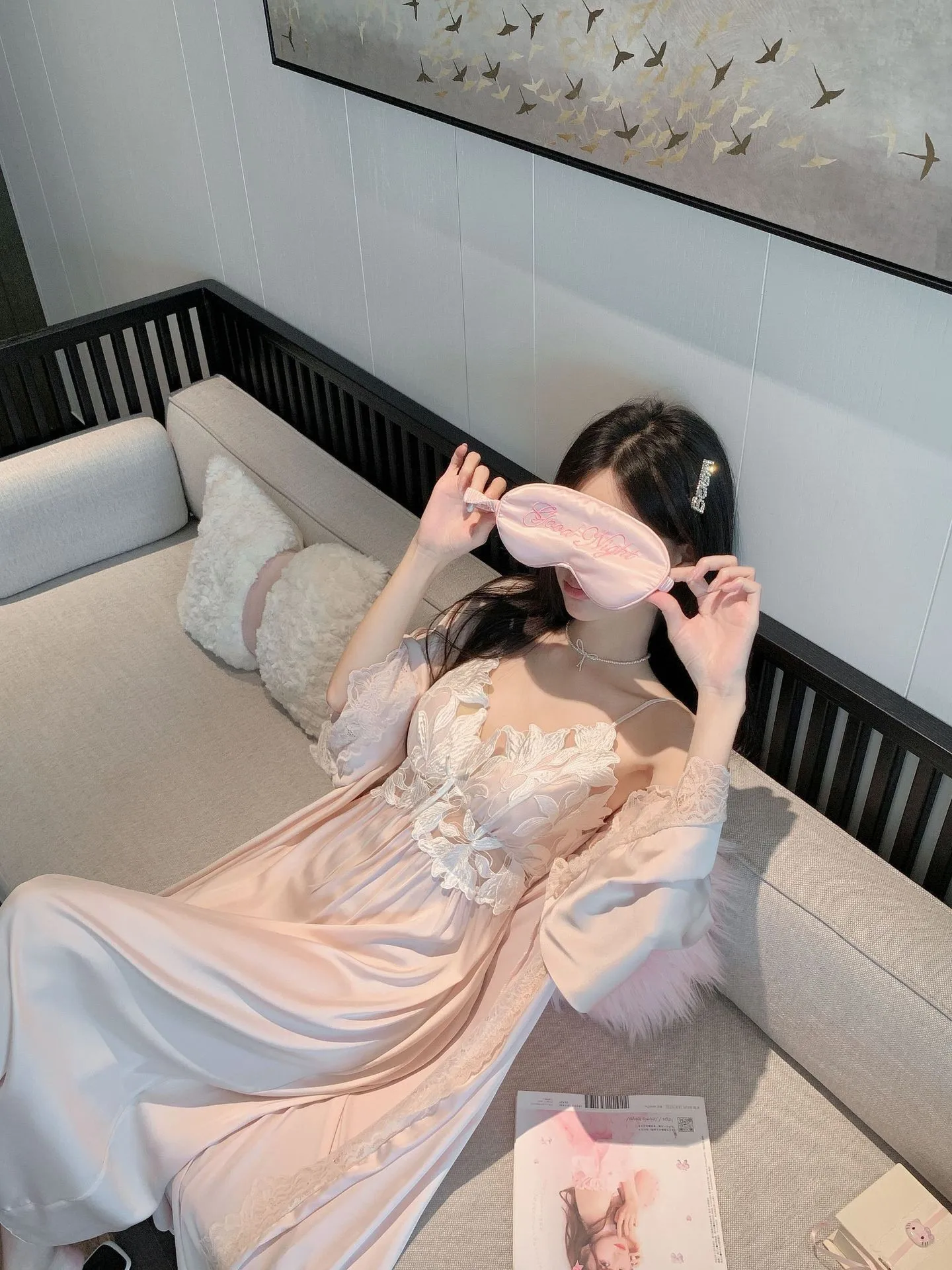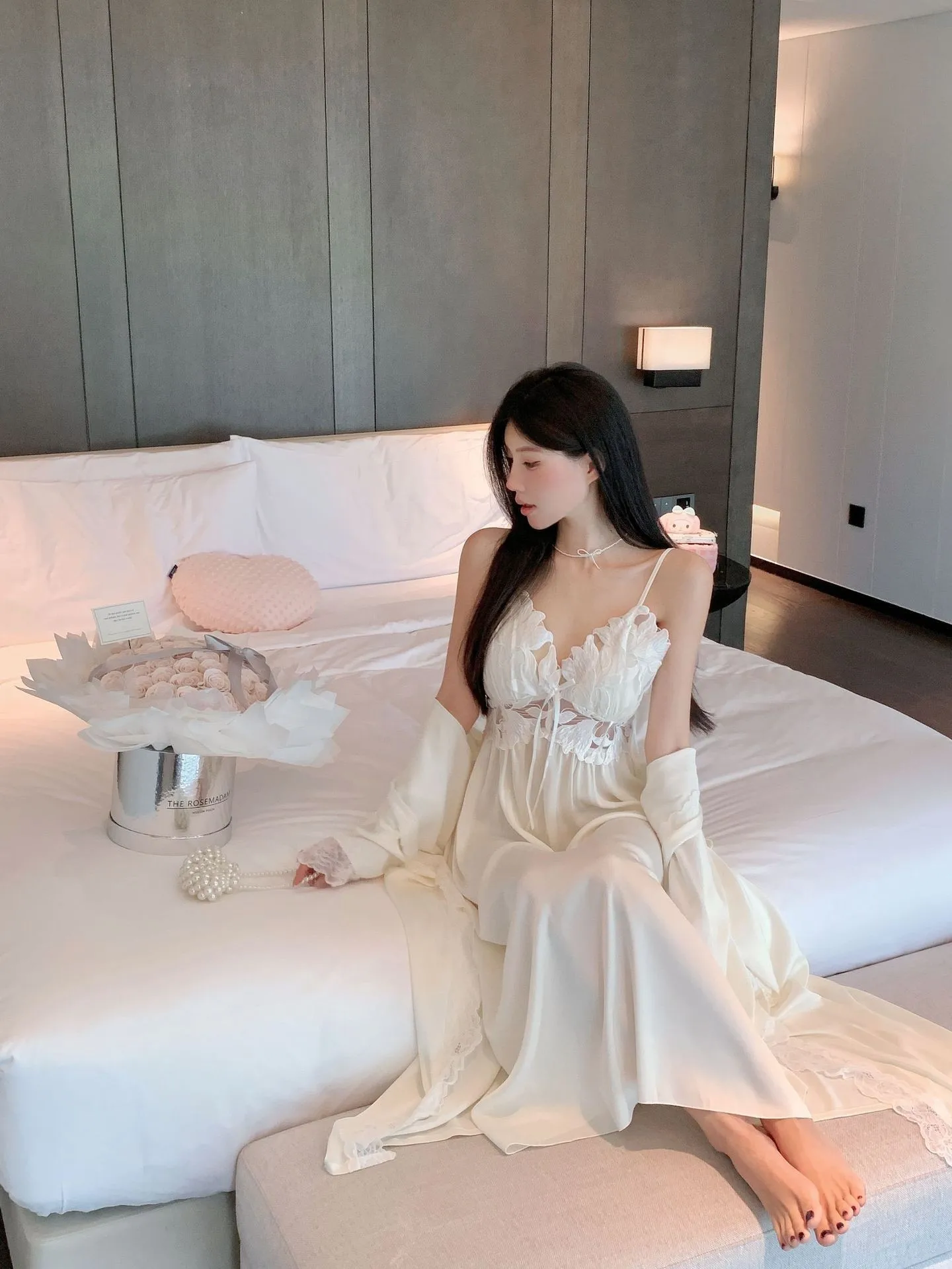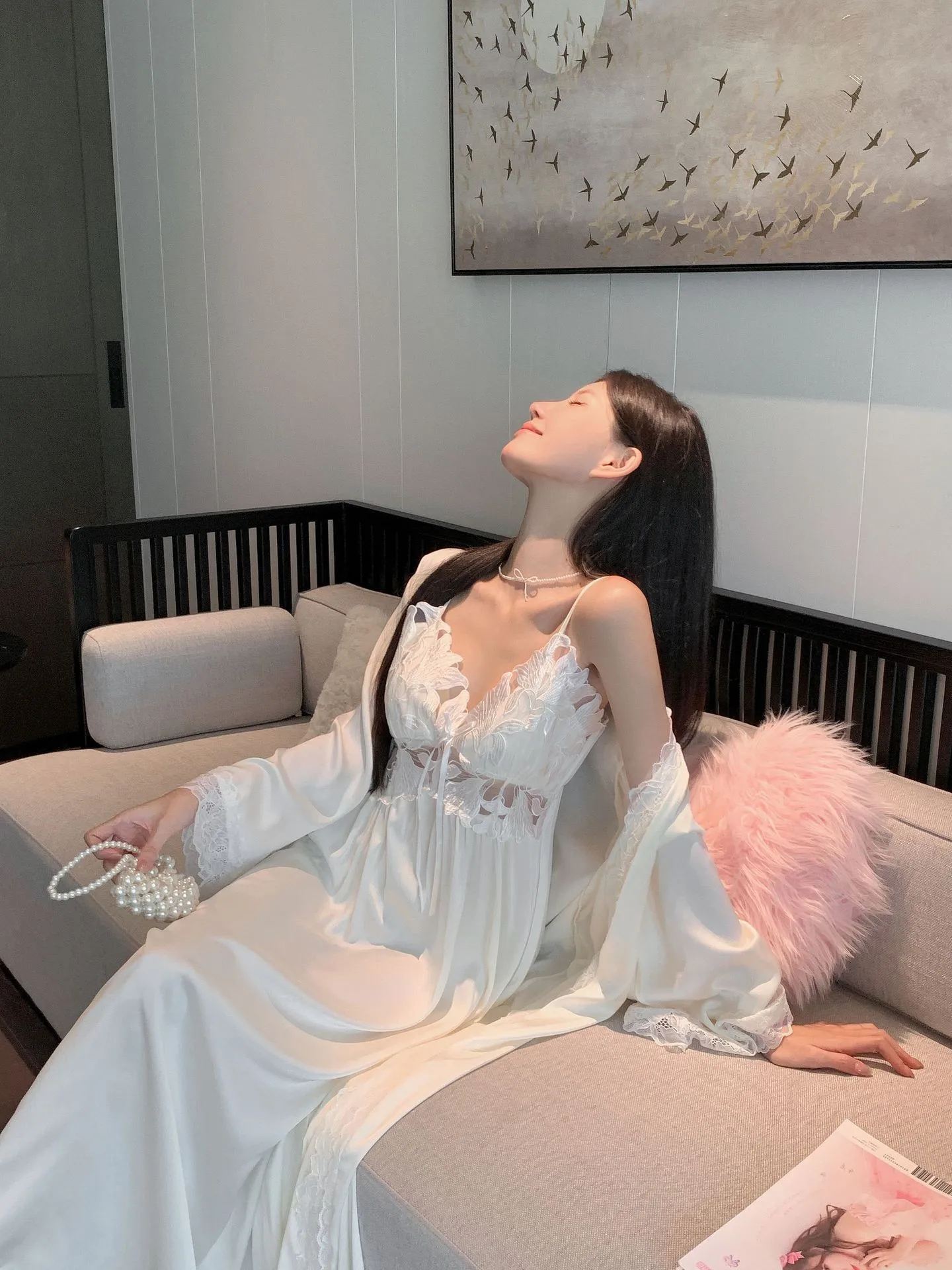 Sexy Black Lace Long Robe Nightgown Female Sleepwear 2Pcs Set Elegant Silky Satin Nightwear Nightdress Loose Homewear Lingerie