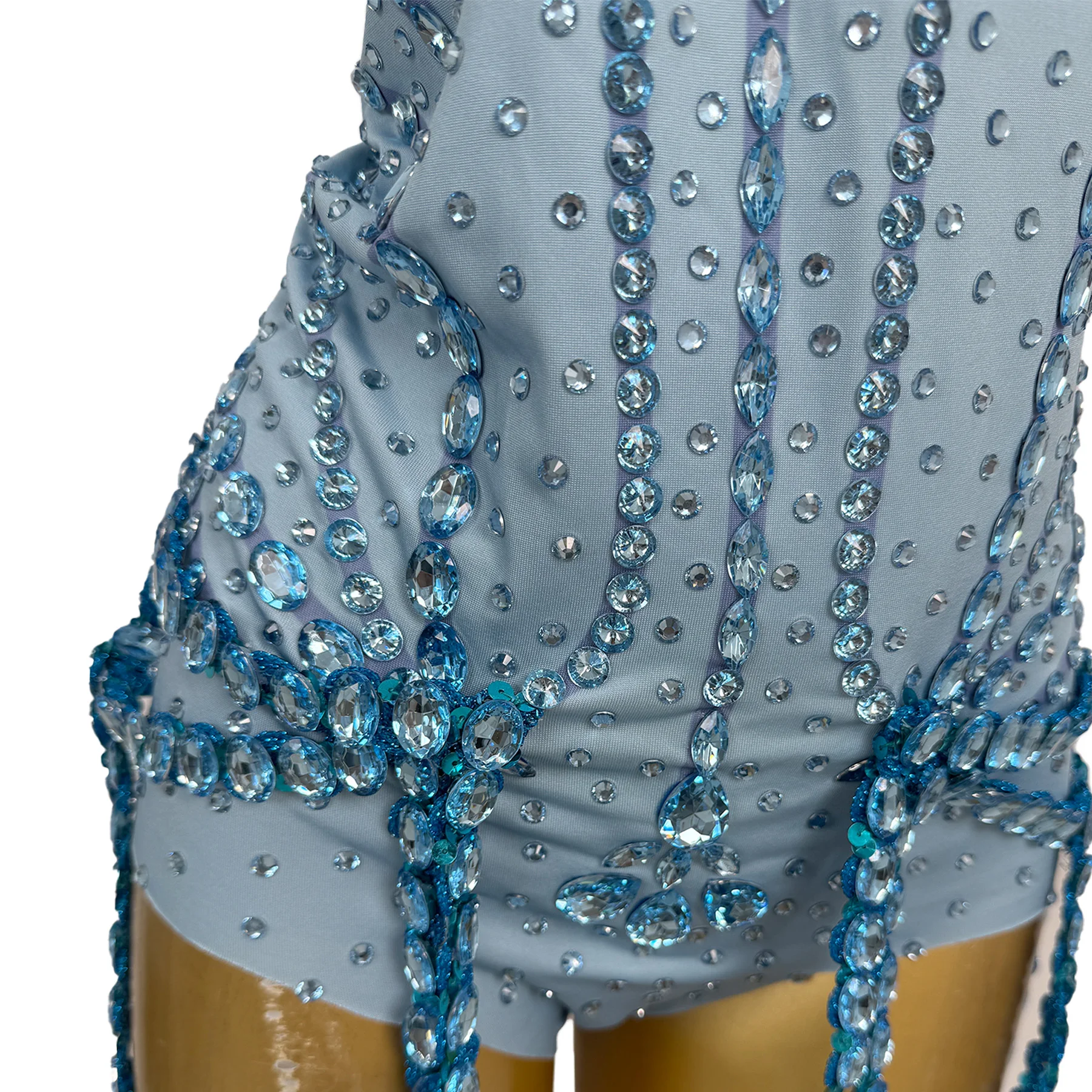 Tianlan Sexy Bar Club Performance Costume Blue Rhinestone Strapless Jumpsuit with Neck Chain Women's Cocktail Prom Party Dress